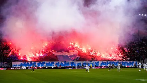 Juste avant le coup d'envoi du gros choc de la 19e journée de Ligue 1 entre l'Olympique de Marseille et le RC Lens, les supporters marseillais, présents dans la tribune sud du Stade Vélodrome, ont craqué un nombre impressionnant de fumigènes en pl...